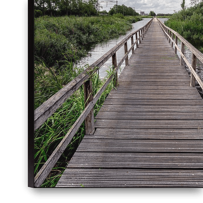 Die hölzerne Fahrradbrücke bei Haarlem, die tief über dem Wasser liegt, ähnelt für immer diesem Werk. Die Perspektive und der große Wolkenhimmel verstärken den Effekt, dass es kein Ende der Brücke gibt. Die symbolische Kraft, die dieses Werk ausstrahlt, passt an jede Wand im Büro oder zu Hause! Auf Anfrage kann dieses Werk auch in…