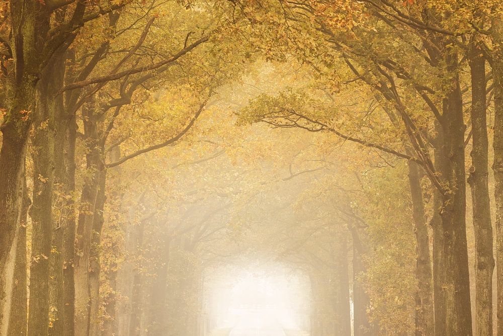 Exloo, Drenthe, Herbst, Allee, Bäume, Nebel, Straße, Landschaft, Stille, Natur, Niederlande, Morgenlicht, Herbstfarben, Stille