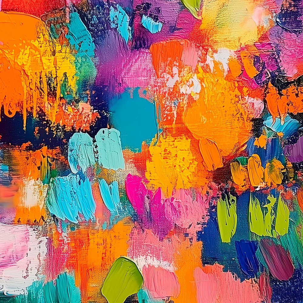 Ein abstraktes Kunstwerk mit einer Explosion von Farben, mit dicken Pinselstrichen, lebendigen und hellen Farbtönen und einem Spachtelstil. Dieses Kunstwerk strahlt Energie und Aufregung aus und zieht mit seiner dynamischen impressionistischen Komposition und der leuchtenden Farbpalette die Aufmerksamkeit auf sich.