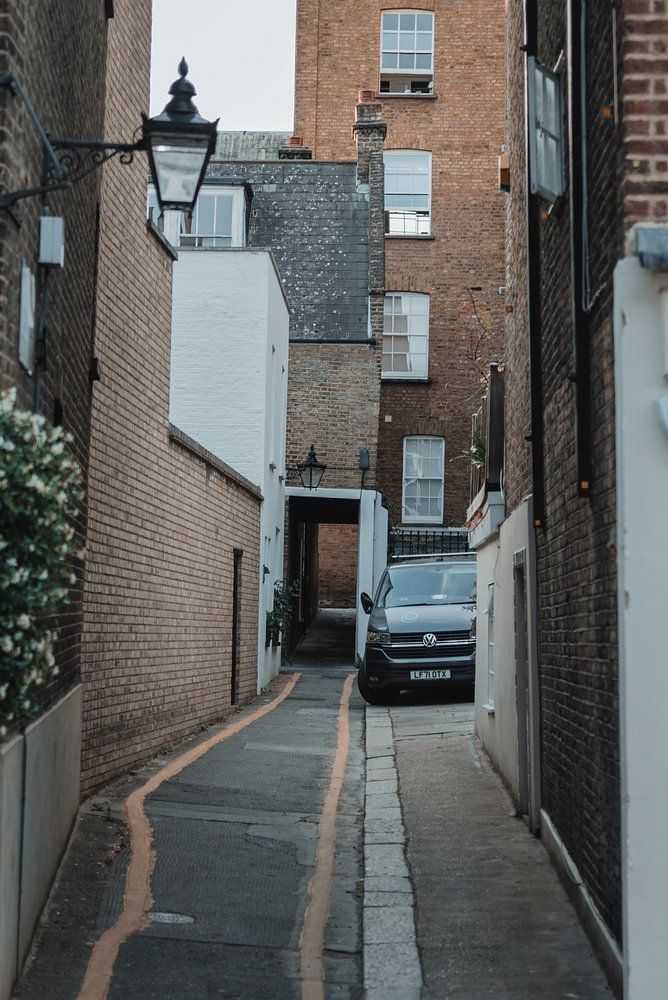 Eine sehr enge Straße, in der man sich die Mühe gemacht hat, Straßenmarkierungen anzubringen. Fotografiert an einem schönen Sommerabend in Notting Hill.