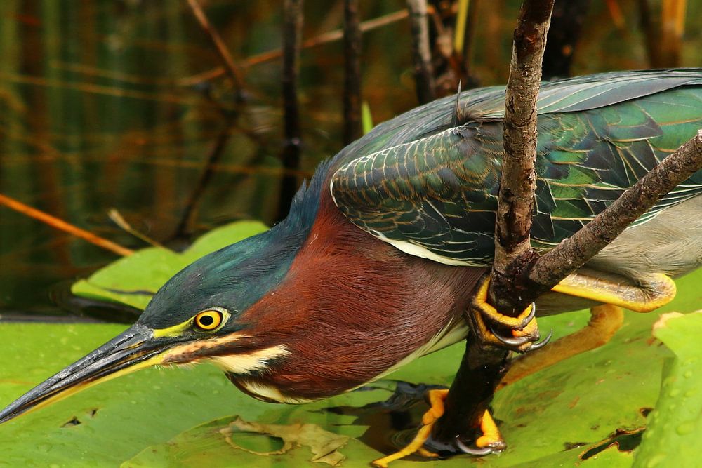 The green heron (Butorides virescens) is a small heron of North and Central America. It was long considered conspecific with its sister species the striated heron (Butorides striata), and together they were called "green-backed heron".