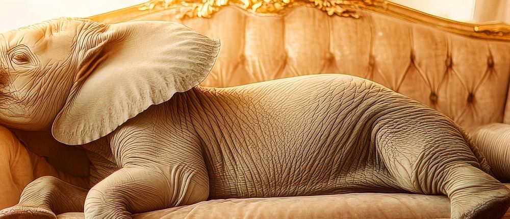 Ein sanfter Elefant ruht sich entspannt auf einer eleganten, goldverzierten Couch und verleiht dem Raum eine charmante, skurrile Note. Die harmonische Farbpalette und das harmonische Design schaffen eine einladende Atmosphäre. Dieses Bild eignet sich perfekt für ein Wohnzimmer, in dem Fantasie und Stil zusammenkommen und für unvergessliche Gespräche sorgen.