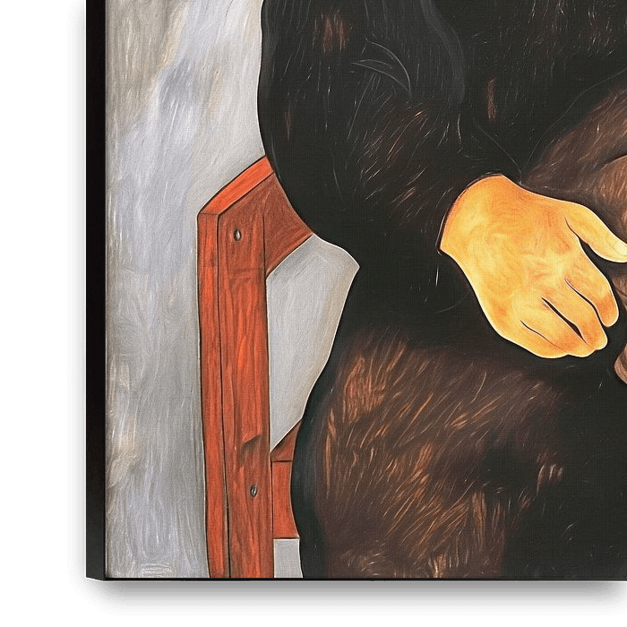 Ein Mann mit Schnurrbart sitzt auf einem Holzstuhl und hält einen kleinen Hund im Arm. Der Mann ist dunkel gekleidet und trägt einen schwarzen Hut, während der Hund mit großen, ausdrucksstarken Augen herausschaut.