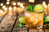 Ein verführerisches Glas mit erfrischendem Getränk ziert eine rustikale Holzoberfläche, umgeben von spritzigem Limettengrün und aromatischer Minze. Das sanfte Licht im Hintergrund wirkt einladend und verwandelt jeden Moment in einen festlichen Anlass. Ideal für die Küche oder das Wohnzimmer, um eine entspannte Atmosphäre zu schaffen.