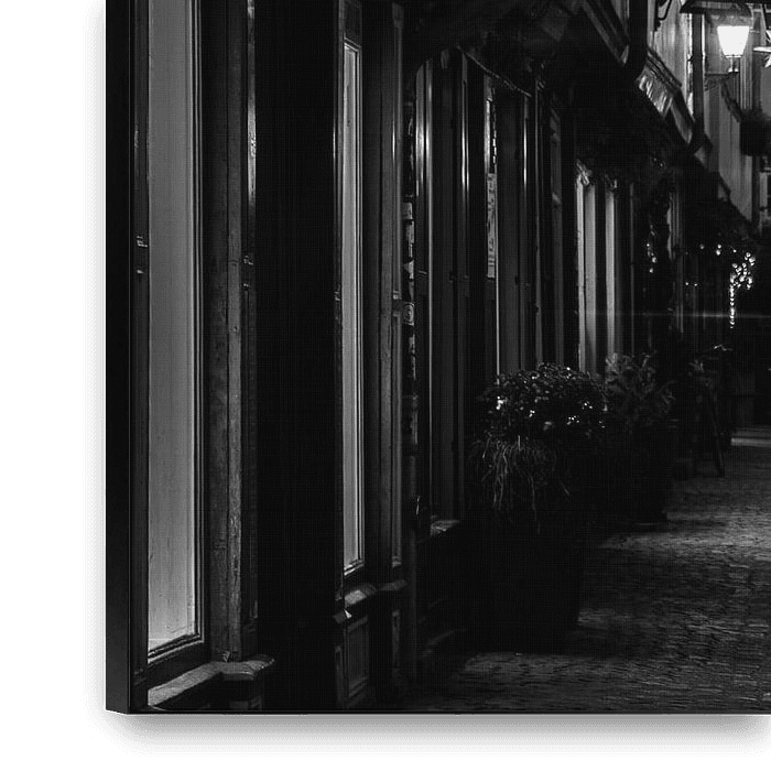 Das Bild zeigt die Krämerbrücke in Erfurt zur Weihnachtszeit – aufgenommen in Schwarz-Weiß, um die architektonischen Details und die Lichtstimmung in den Vordergrund zu rücken. Die historische Brücke ist gesäumt von Fachwerkhäusern, deren Fenster teilweise beleuchtet sind. Über der gepflasterten Straße spannen sich Lichterketten, die…