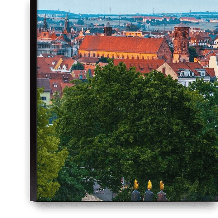Das Bild zeigt eine Panoramaansicht der Altstadt von Erfurt mit dem markanten Ensemble des Erfurter Doms und der Severikirche im Zentrum. Die gotischen Türme ragen über die Dächer der Stadt hinaus und prägen die Silhouette. Im Vordergrund rahmen grüne Baumkronen das Motiv ein, während sich im Hintergrund die Stadtlandschaft bis zum…