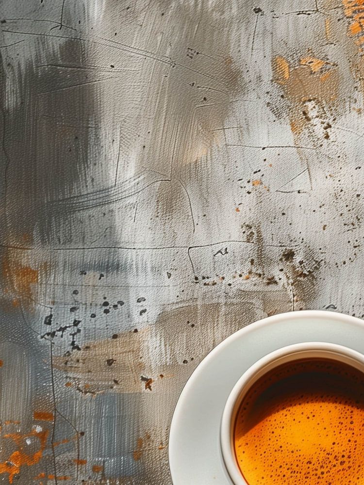 Espressotasse vor einem verwitterten, abstrakten Hintergrund mit Grau- und Orangetönen. Die Tasse ist weiß und schlicht, wodurch die satte, dunkelbraune Farbe des Espressos hervorsticht. Die Textur des Kaffees ist detailliert, mit einer feinen Crema auf der Oberfläche. Der Hintergrund wirkt rau und industriell, mit Pinselstrichen und Flecken in verschiedenen Grau- und Orangetönen, die einen starken Kontrast zu der zarten Tasse bilden.