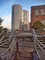 Blick auf die Türme des Cinemaxx Kinos in Essen von einer Fussgängerbrücke aus mit der darunter sichtbaren Strasse