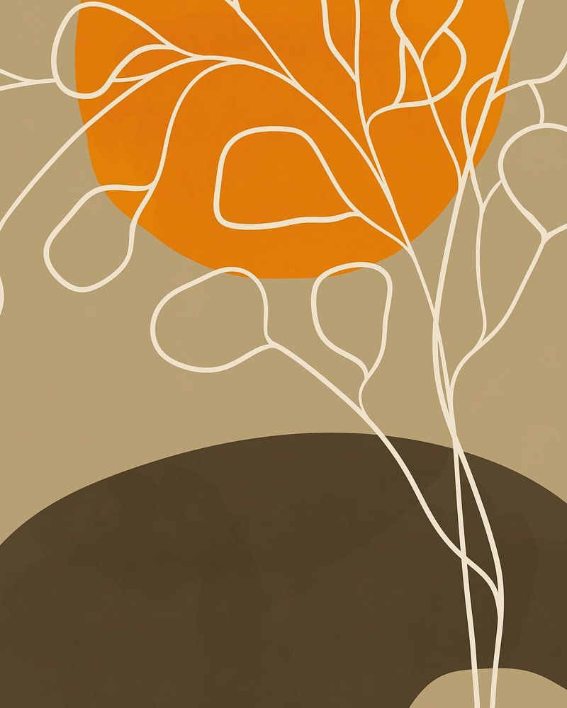 Minimalistische Illustration in den Farben des Herbstes: orange, weiß, hellbraun und dunkelbraun. Die abstrakte Landschaft zeigt einen stilisierten Eukalyptusbaum an einem kleinen See mit der Sonne im Hintergrund.
