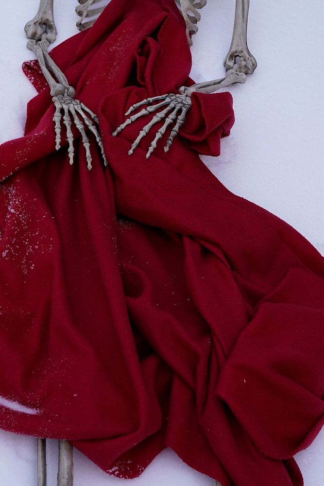 Ewige Liebe Skelett mit roter Rose in weißem Schnee
