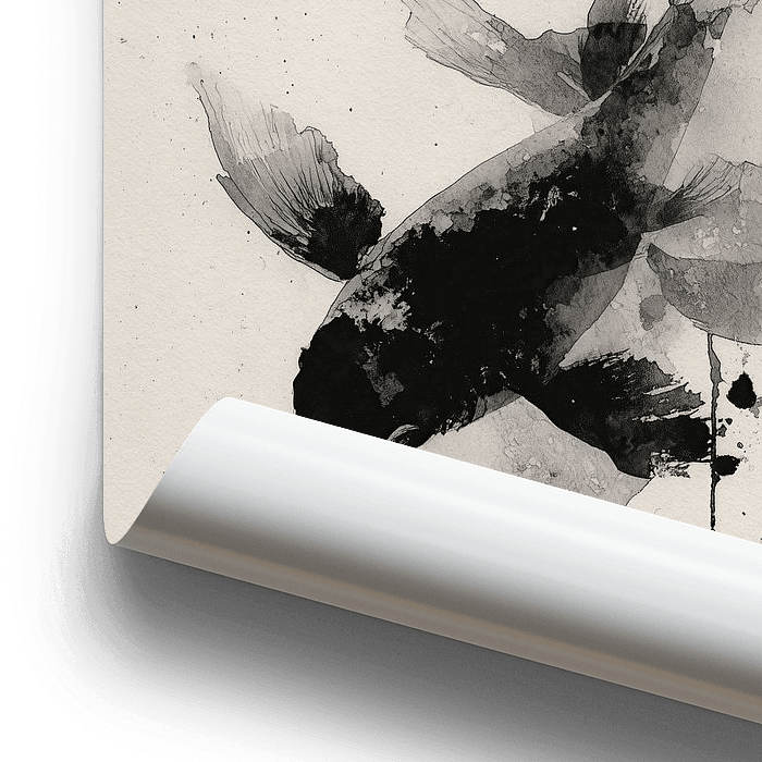 Ein minimalistisches Tuschebild zweier Koi-Fische, die sich anmutig umkreisen und Gleichgewicht, Fluss und Dualität symbolisieren. Die abstrakte Aquarelltechnik verbindet Bewegung und Gelassenheit in zeitlosen monochromen Tönen