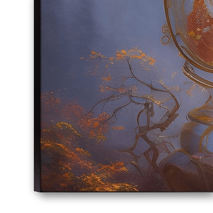 Ein gläsernes Fabergé-Ei steht in einer fantastischen Herbstlandschaft mit Bergen und braunen Bäumen.