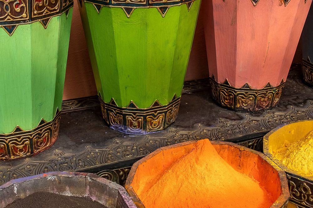 Buntes Pulver in schön gefärbten Körben. Das farbige Pulver wird zum Färben von Kleidung in Marrakesch, Marokko, verwendet.