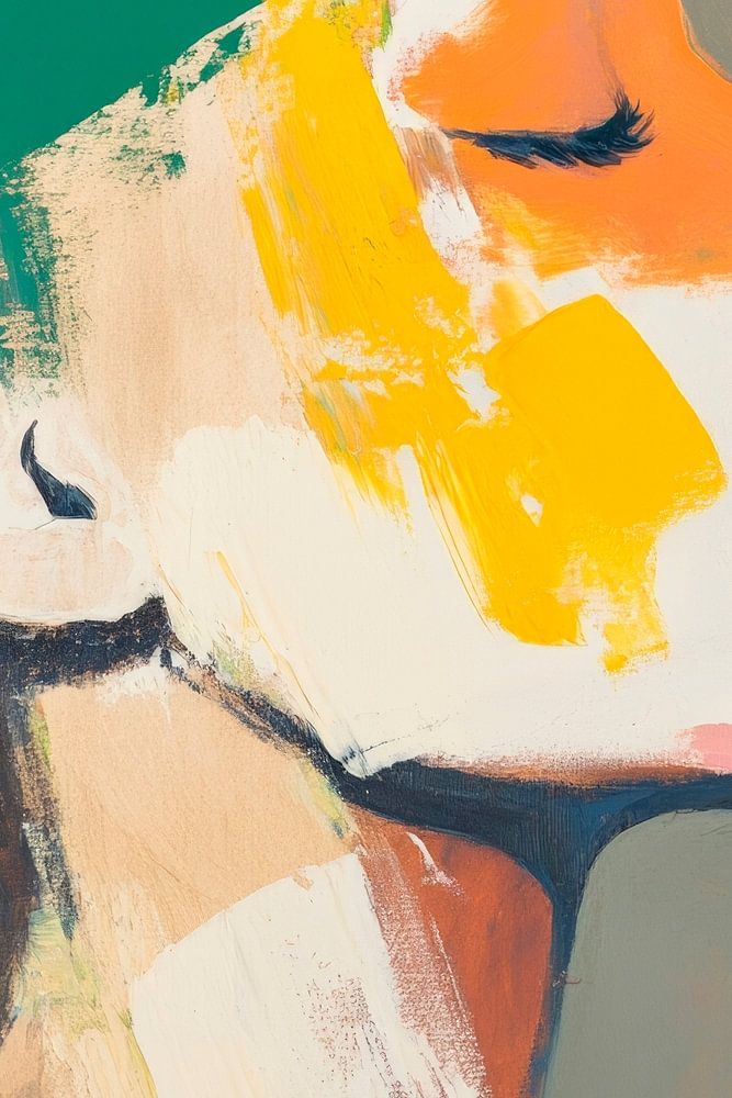 Ein faszinierendes Porträt, das mit lebhaften Farbklecksen spielt und die Anmut und Stärke einer Frau eindrucksvoll einfängt. Die harmonische Verbindung von sanften und kräftigen Tönen verleiht dem Werk eine lebendige Energie. Ideal für das Wohnzimmer, wo es inspirierende Gespräche und kreative Gedanken anregt.