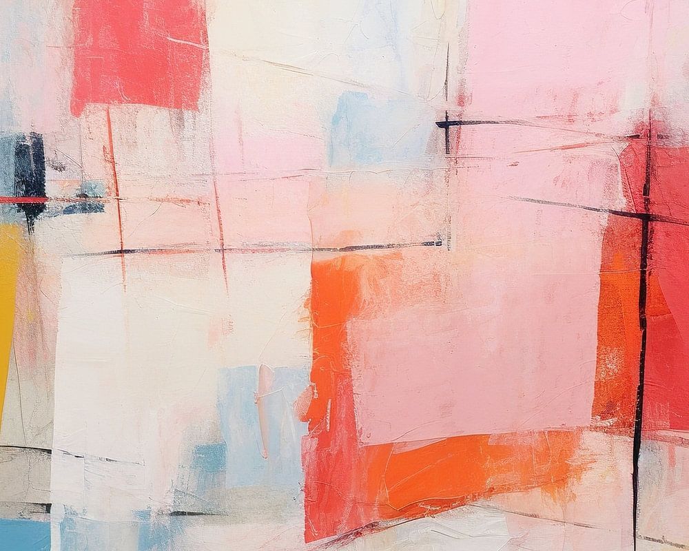 Farben | Abstrakter Energiefluss - Dieses abstrakte Gemälde zeigt eine dynamische Anordnung sich überlappender Rechtecke und Linien in einer Reihe von Farben, mit markanten Bereichen in Rot und Blau auf einem überwiegend beigen Hintergrund.