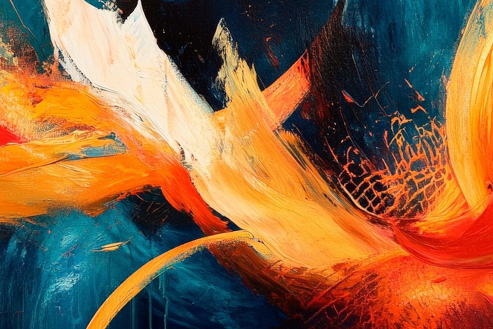 Leuchtende Rot- und Orangetöne tanzen dynamisch über einen tiefblauen Hintergrund, als ob sie direkt aus einer kreativen Explosion hervorgegangen wären. Diese kraftvolle Komposition strahlt Energie und Leidenschaft aus, perfekt, um in einem modernen Wohnzimmer für Gesprächsstoff zu sorgen oder als inspirierendes Element im Büro.