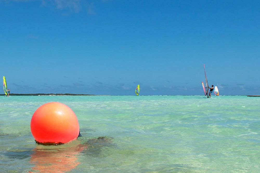 Farbfoto des blauen Karibischen Meeres in Bonaire mit einer leuchtend orangen Boje im Wasser. Im Hintergrund Surfer im Wasser.