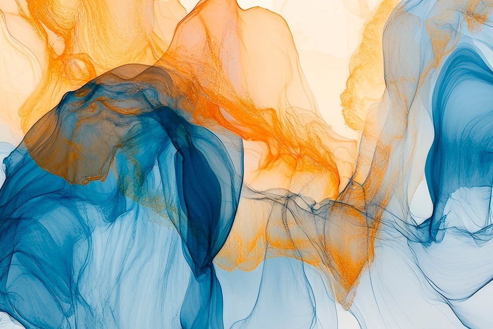 Zarte Wellen aus Blau und sanften Orangetönen tanzen harmonisch über einen hellen Hintergrund, als ob sie Geschichten von Freiheit und Kreativität erzählen. Dieses abstrakte Meisterwerk bringt eine beruhigende Atmosphäre in jedes Wohnzimmer, perfekt, um entspannte Gespräche zu fördern oder einfach nur den Blick schweifen zu lassen.