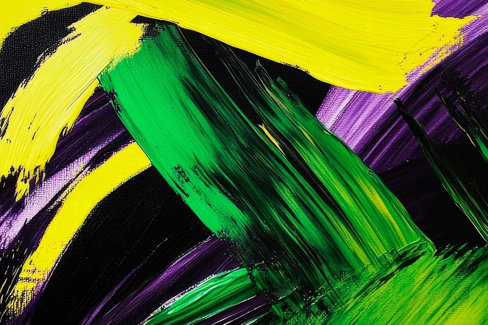 Mit lebendigen, kraftvollen Pinselstrichen in leuchtendem Gelb, erdigem Grün und intensivem Violett entfaltet sich ein faszinierendes Farbspiel. Diese dynamische Komposition bringt Energie und Kreativität in jeden Raum, ideal für ein Schlafzimmer oder ein kreatives Büro, wo sie Inspiration und ein Gefühl von Lebensfreude verbreitet.