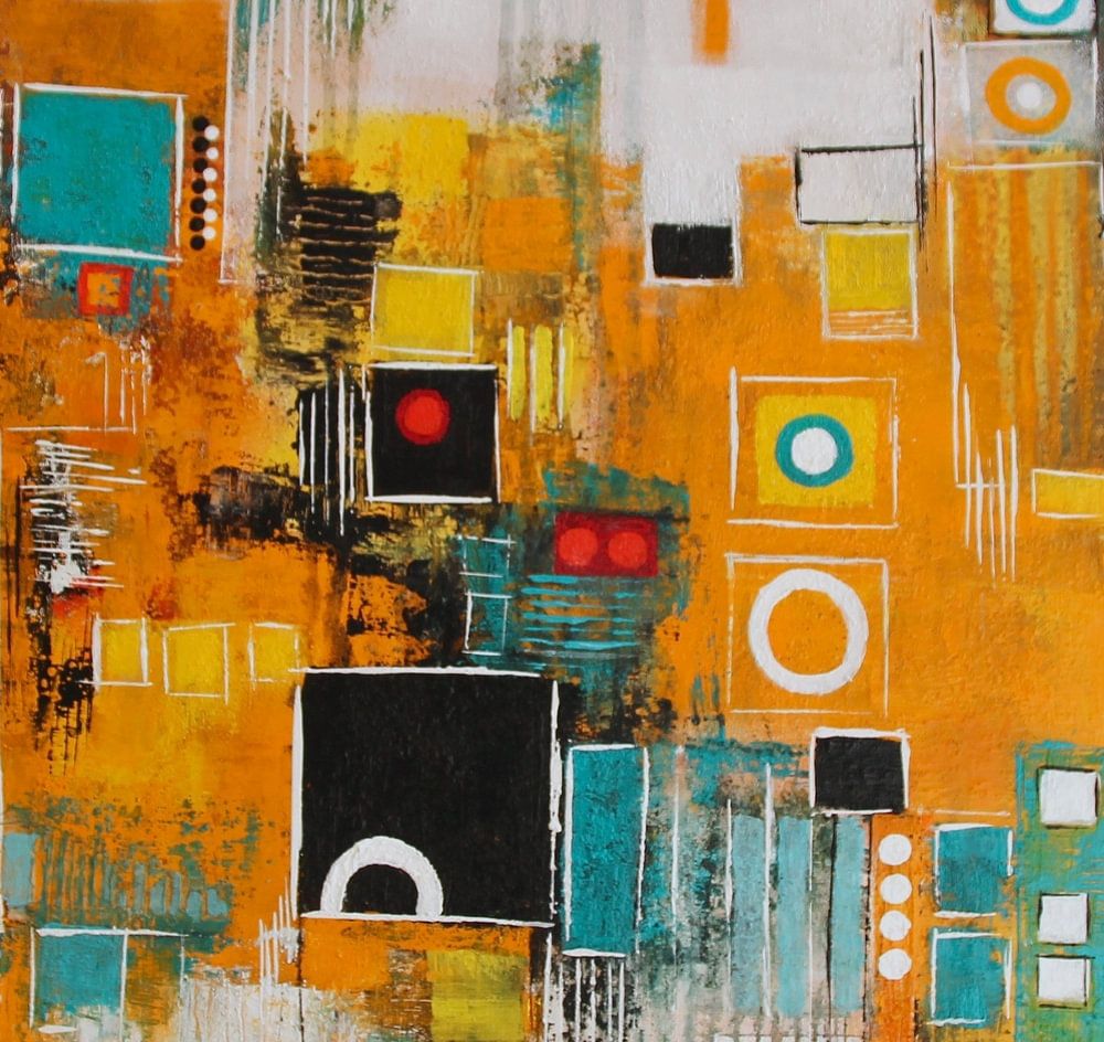 Farbenfrohe Komposition aus Flächen und Linien, Orange, Gelb, Türkis, Weiß, modern und dekorativ, grafisch, kontrastreich, zeitgenössisch, Leinwandbild für den modernen Wohnbereich, Wanddekoration für Büro oder Praxis, Malerei in Acryl