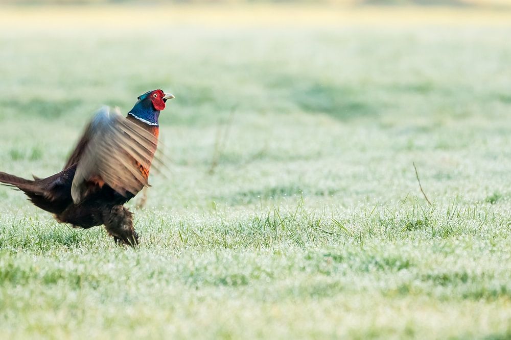 An einem sonnigen Tag im Frühling paradiert ein schöner Fasan über das Gras