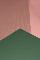 Dieses Kunstwerk zeigt ein kräftiges grünes Dreieck, das von unten scharf in die Bildmitte ragt und Stabilität ausstrahlt. Oben dominiert ein Rosa-Ton mit einer scharfen Kante, die leicht nach rechts versetzt ist und die Spitze des Dreiecks bewusst verfehlt – ein subtiler Bruch in der Symmetrie. Links erstreckt sich eine lineare…