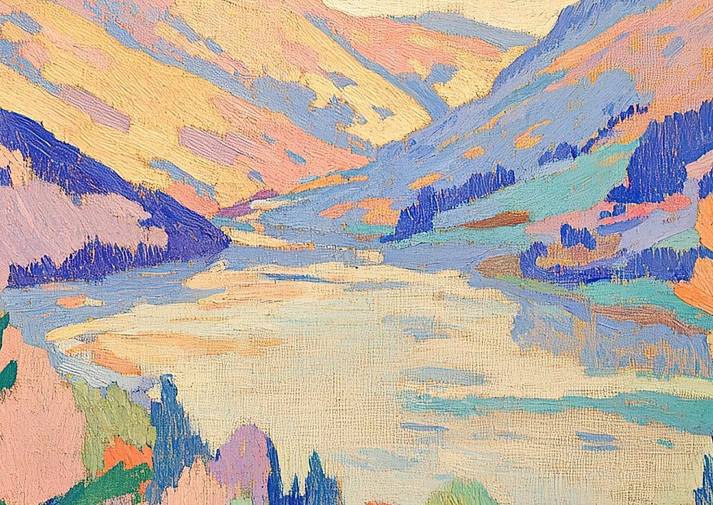 Eine Landschaft, die die wunderschöne Landschaft des Lake Tahoe im Frühling darstellt. Das Gemälde zeigt Pastellfarben, sanfte Hügel und Bäume, einen Fluss, der durch das Tal fließt, sowie bunte, detaillierte und ausdrucksstarke Pinselstriche