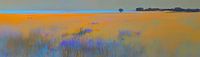 veld | Goud Veld en Blauwe Lijn - Dit is een landschap waarin twee dingen direct je aandacht grijpen: een enorme, gloedende gouden vlakte en daarboven een smalle, intens blauwe band die als een scheidslijn de lucht van het land scheidt. Het veld neemt bijna het hele doek in; het ligt als een warme deken van oranje-goud over het oog,…