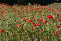 Liegendes Bild eines Feldes voller roter Mohnblumen