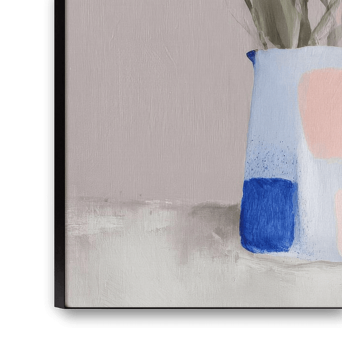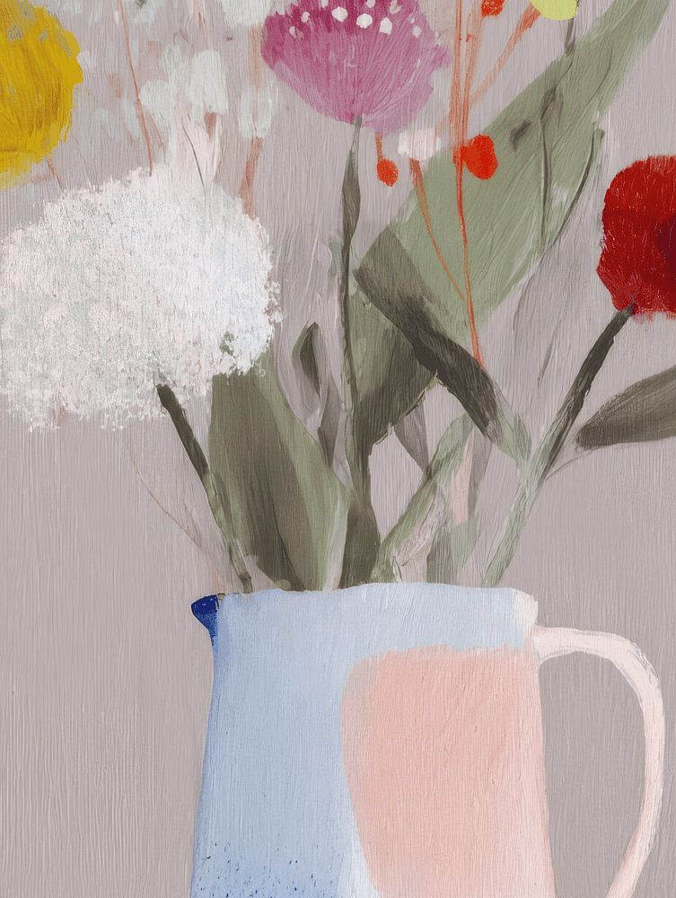 Ein floraler Kunstdruck mit einem lässig gepflückten Feldblumenstrauß in einem hellblauen Krug. Die weichen Pinselstriche und subtilen Farbverläufe verleihen diesem Werk eine warme, ruhige und sehr natürliche Ausstrahlung. Für ein Interieur mit einer poetischen und kreativen Stimmung.