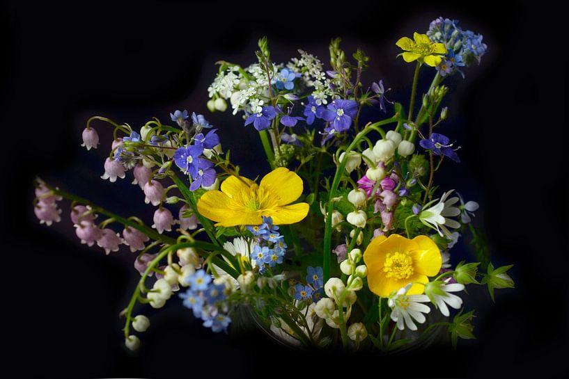 Ein Foto von einem Strauß Wildblumen. Ich habe die Blumen vor einem schwarzen Hintergrund fotografiert. In meinem Garten in Frankreich habe ich rosa Maiglöckchen gefunden. Ich wusste nicht, dass es solche gibt, und habe sie in den Strauß mit aufgenommen. Außerdem sind noch normale Maiglöckchen, weiße Butterblumen und Vergissmeinnicht…