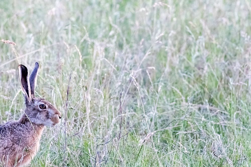 Feldhase (Lepus europaeus) auf einer Wiese im Sommer in Frankfurt, Deutschland.