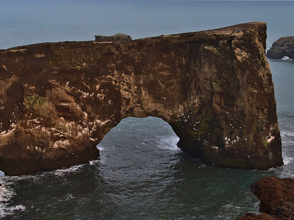Blick auf den berühmten Felsenbogen auf der Halbinsel Dyrholaey an der Südküste von Island in der Nähe von Vík í Mýrdal im Abendlicht.