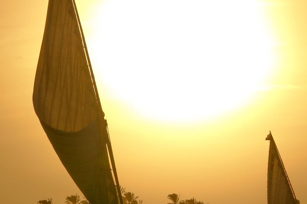 Eine Brise im Segel, ein bisschen Segeln auf dem Nil. Der Sonnenuntergang geht hinter den Bergen von Luxor in Ägypten unter.