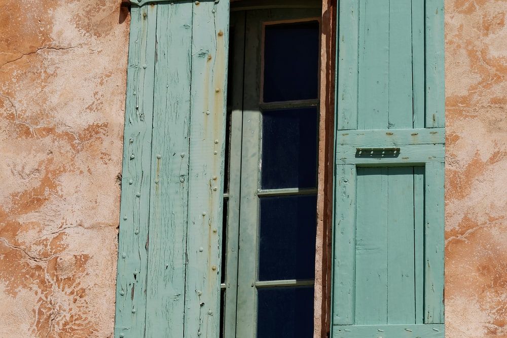 Altes Terrakotta-Landhaus mit grünen Fensterläden in Südfrankreich, Lérins-Inseln, Frankreich, Côte d'Azur, Provence-Alpes-Côte d'Azur, Europa. Ländlicher, retro, minimalistischer, romantischer Einrichtungsstil.