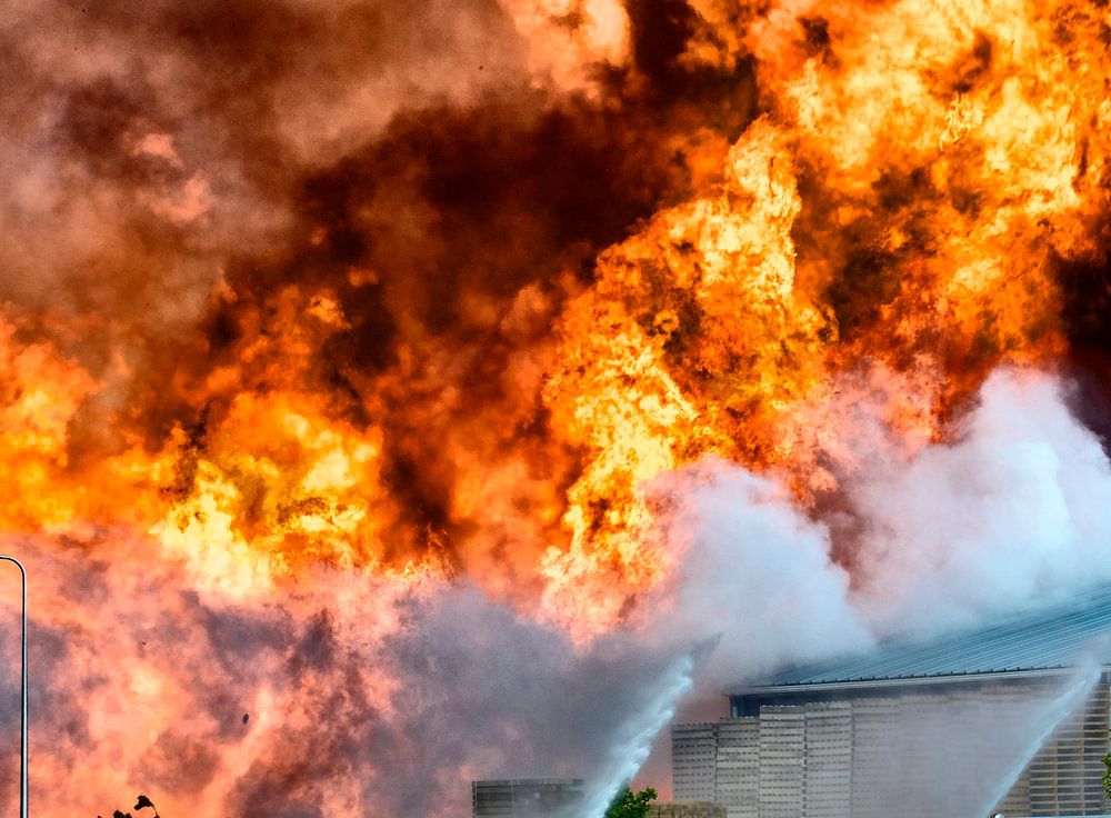 Feuerwehrauto vor einem Brand in einem Industriegebiet mit riesigen Flammen im Hintergrund.