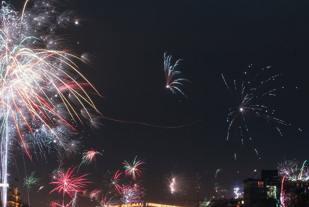 Amsterdam Niederlande Neujahrsfeierlichkeiten im Stadtzentrum. Ein Feuerwerk läutet das neue Jahr über der Amstel ein.