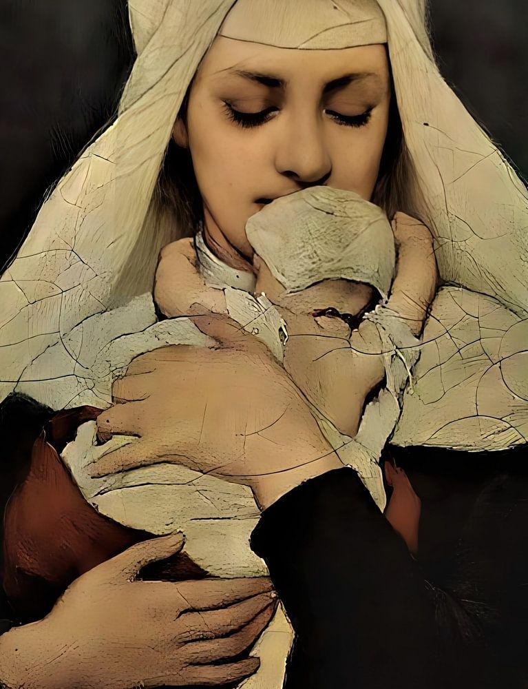 Findelkind von Gabriel von Max zeigt eine ergreifende Szene eines verwaisten Babys, das von einer mitfühlenden Nonne umsorgt wird. Das Kunstwerk fängt den zärtlichen Moment ein, in dem die Nonne den Säugling in ihren Armen wiegt und ihm Trost und mütterliche Liebe spendet. Die Künstlerin stellt die Emotionen in den Gesichtern der Nonne und des Kindes gekonnt dar und vermittelt ein Gefühl von Mitgefühl, Schutz und Wärme. Die weiche und gedämpfte Farbpalette verstärkt den emotionalen Ton des Gemäldes und vermittelt ein Gefühl von Gelassenheit und Zärtlichkeit. Mit diesem Kunstwerk erkundet von Max Themen wie mütterliche Fürsorge, Empathie und die fürsorgliche Rolle von Institutionen in der Gesellschaft.