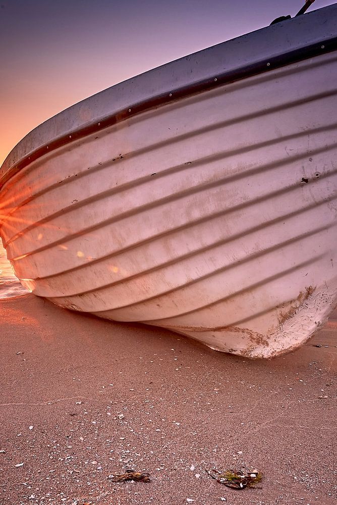 Das Foto mit dem Titel "Fischerboot am Strand bei Sonnenaufgang an der Ostsee" fängt die zauberhafte Atmosphäre eines frühen Morgens an der Ostseeküste ein, in dem ein Fischerboot ruhig am Ufer liegt und die Magie des Sonnenaufgangs einfängt.