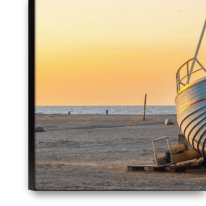 Bestelle das Foto Fischerboote am dänischen Strand bei Sonnenuntergang. von Menno Schaefer als Reproduktion auf Leinwand, Alu-Dibond, als Poster, Fototapete oder Acrylglasbild.