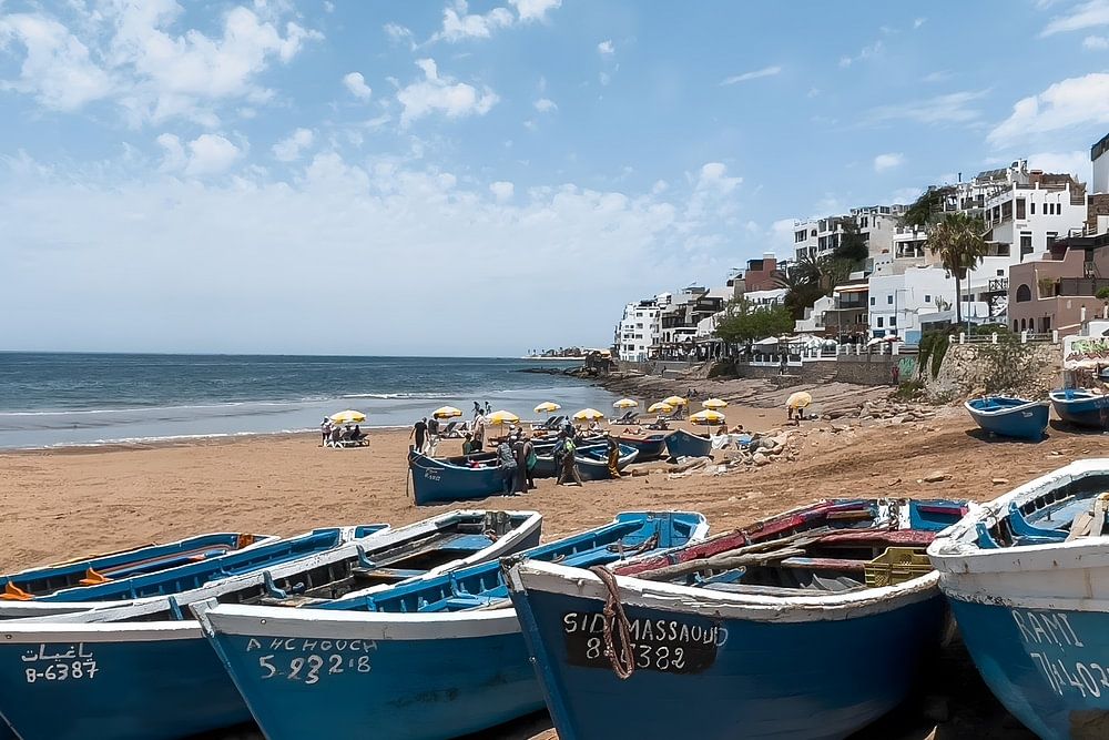 Marokkanische blaue Fischerboote am Strand von Taghazout an einem klaren Sommertag. Die weißen Häuser des Dorfes Taghazout im Hintergrund.