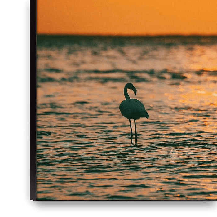 Bestelle das Foto Flamingos bei Sonnenuntergang in Walvis Bay Namibia, Afrika von Patrick Groß als Reproduktion auf Leinwand, Alu-Dibond, als Poster, Fototapete oder Acrylglasbild.