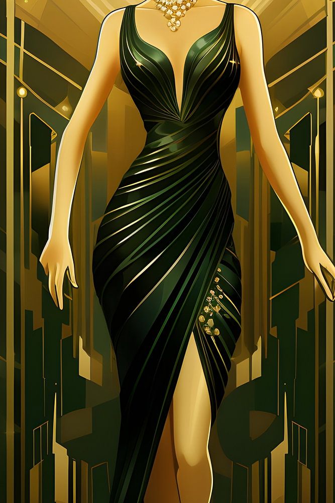 In einer eleganten Art-Deco-Illustration wird ein Flappergirl in schillerndem Grün und glänzendem Gold dargestellt. Ihr Haar ist im typischen Stil der 1920er Jahre frisiert, mit welligen Locken.Sie trägt ein figurbetontes Kleid mit Linien und Perlenverzierungen, das ihre Bewegungen betont. Ihr Blick ist voller Selbstbewusstsein und Anmut, während sie inmitten eines stilvollen Hintergrunds aus geometrischen Formen und goldenen Akzenten posiert. Die Illustration strahlt eine zeitlose Eleganz und den Glanz der Roaring Twenties aus.