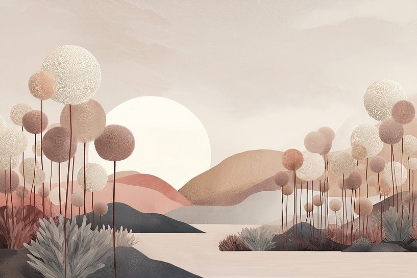 Diese Landschaft fängt einen Moment heiterer morgendlicher Stille ein, in dem das Licht sanft über die Erde fließt. Der Himmel ist beige, beruhigend und warm und bildet eine ruhige Kulisse für die langsam aufgehende weiße Sonne. Ihr Licht ist diffus und subtil, nicht überwältigend, sondern eine sanfte Berührung, die die Konturen der…