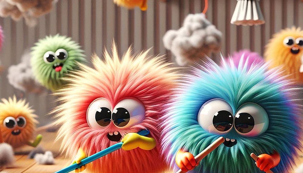 Das Bild zeigt eine heitere Szene voller Energie und Farbe: Zwei bunte, flauschige Monster haben die Aufgabe übernommen, den Holzboden eines gemütlichen Zimmers zu reinigen. Mit Besen ausgestattet, die sie mit ihren winzigen Händen kaum zu halten scheinen, scheinen sie mehr Spaß zu haben als ernsthaft zu putzen. Staubwolken schweben in der Luft, was auf ihre lebhaften Reinigungsversuche hindeutet. Andere kleine Monster in verschiedenen Farben und Formen helfen mit oder schauen zu, einige davon hängen an Lampen und Regalen oder lehnen lässig an Putzeimern. Das Zimmer ist sonnendurchflutet und lässt die Staubteilchen im Lichtstrahl tanzen. Überall liegen Farbspritzer und Putzutensilien verstreut. Das Durcheinander vermittelt eine Atmosphäre von Chaos und Vergnügen, weit entfernt von der Monotonie alltäglicher Hausarbeit. Es ist eine Szene, die Lebendigkeit und Fröhlichkeit ausstrahlt, und einen gewöhnlichen Haushalt in einen Ort der Freude und des Lachens verwandelt.
