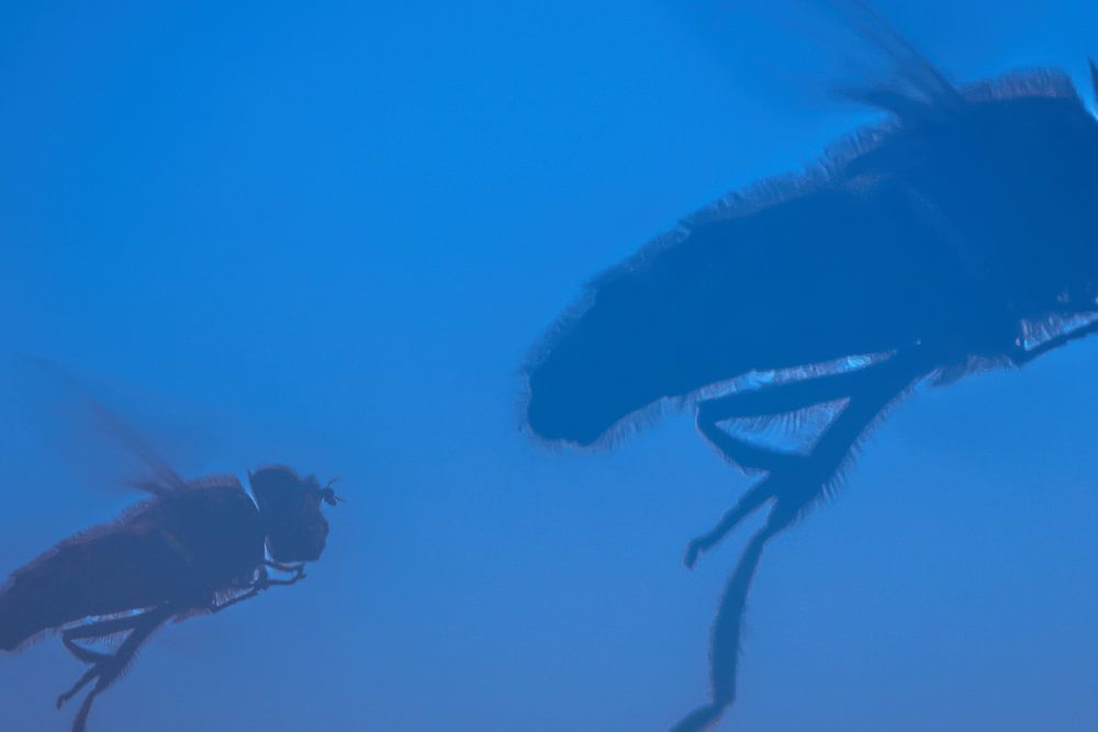 Die Doppelbelichtung wurde mit Hilfe eines Bearbeitungsprogramms erstellt. Die Biene wird gegen einen blauen Himmel fotografiert, ich habe diese Farben mit Hilfe eines Filters verstärkt.