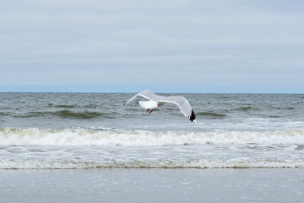 Dieses schöne Bild durch das Meer mit einer Fliegenseemöwe im Vordergrund. Der bewölkte Himmel mit einem dunklen Meer sorgt dafür, dass die Möwe deutlich sichtbar ist.