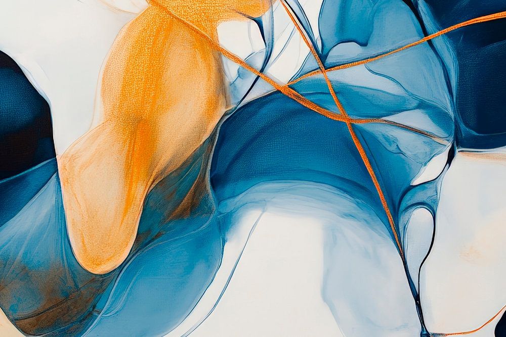 Sanfte Wellen aus tiefem Blau und leuchtendem Gold tanzen harmonisch über eine helle Fläche. Die fließenden Linien erzeugen ein Gefühl von Ruhe und Bewegung, perfekt für ein modernes Wohnzimmer, wo sie die Kreativität anregen und eine entspannende Atmosphäre schaffen. Ideal, um Gäste zu beeindrucken und Gespräche zu inspirieren.