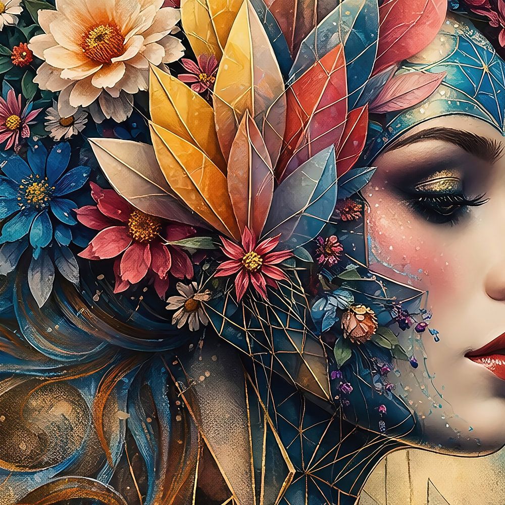 Dieses Werk zeigt ein weibliches Profil, das mit einer üppigen, farbenfrohen Auswahl von Blumen und Blättern geschmückt ist, die ihren Kopf krönen. Der Stil kombiniert figurative und abstrakte Elemente mit geometrischen, goldenen Linien, die durch das Gesicht der Frau und über ihren Hals verlaufen und einen modernen, fast kristallinen…
