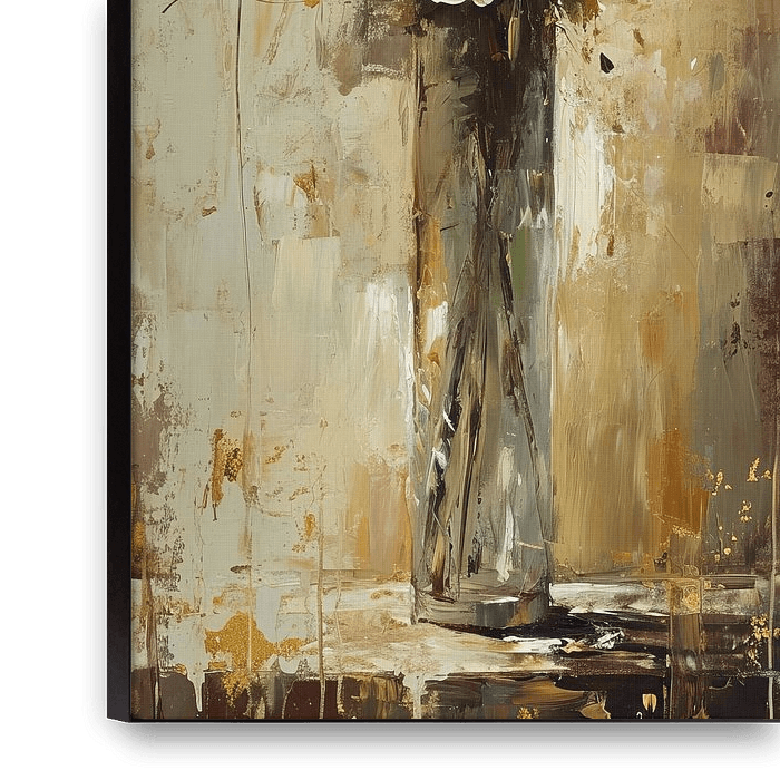 Blumenpracht - Dieses Gemälde stellt eine impressionistische Blumenvase dar, bei der Textur und Farbnuancen die Hauptrolle spielen. Die Künstlerin verwendet eine reiche Palette von Erdtönen, von Beige bis Braun, mit goldenen Akzenten, die ein rustikales und warmes Aussehen verleihen. Die Akzente in Weiß und Rosa verleihen dem Ganzen…